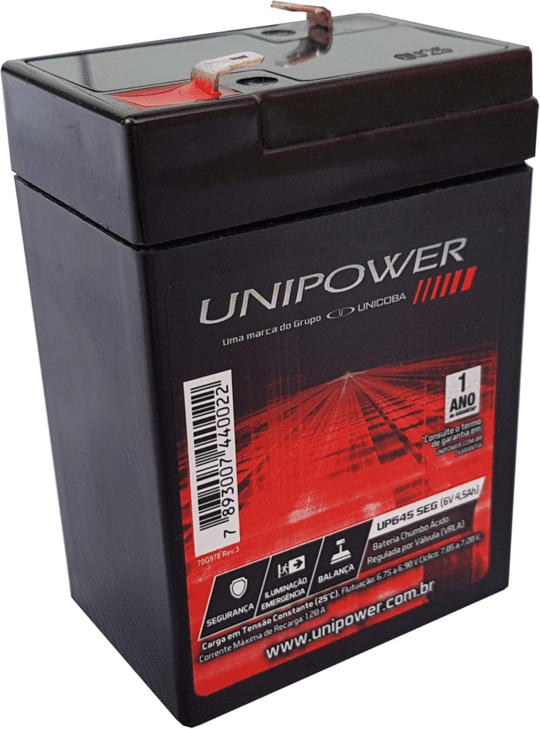 A Bateria Unipower BP06-4.5 é uma bateria de chumbo-ácido selada regulada por válvula (VRLA) com tensão nominal de 6 Volts e capacidade de 4,5 Ah.