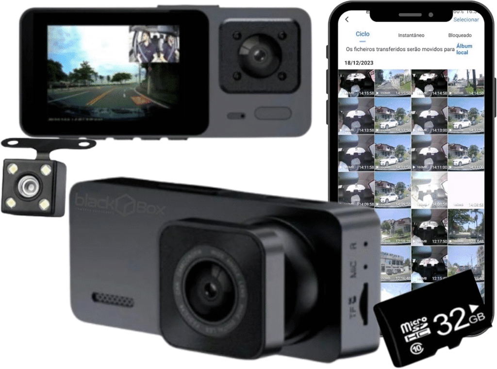 A Black Box GP3 oferece gravação frontal, interna e traseira, garantindo cobertura total do veículo e acesso simplificado via aplicativo Wi-Fi.