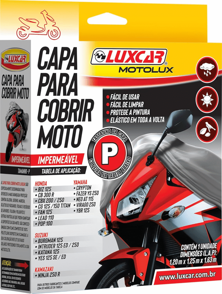 Leve e fácil de manusear, a capa se adapta a diversos modelos populares de Honda, Yamaha, Suzuki e Kawasaki, garantindo proteção contra poeira, sol e pequenos impactos.